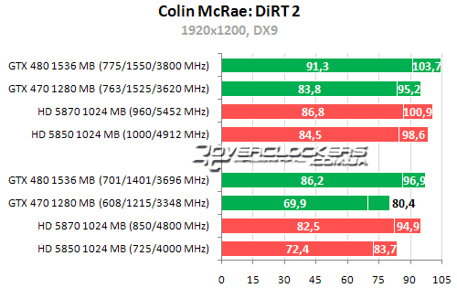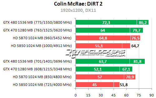 И в номинале, и в разгоне Radeon HD 5850 является аутсайдером. Преимущество GeForce GTX 470 доходит до 12% при стандартных частотах.