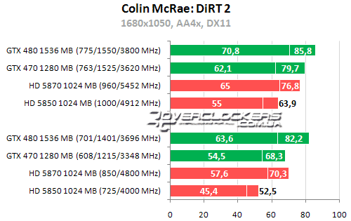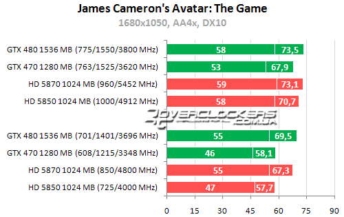 Довольно неожиданное и весьма значительное отставание младшего Radeon от старшей карты HD 5870, которое составляет 38 %. Возможно, столь большая цифра в данном приложении частично обусловлена разными версиями драйверов, и Catalyst 10.3 могли бы снизить такой разрыв на несколько процентов. GeForce GTX 470 демонстрирует результаты на 17% выше конкурента, в разрешении 1680х1050 при MSAA 4x — это и вовсе 21%. Впрочем, как и в других приложениях, отличный разгонный потенциал помогает Radeon HD 5850 достичь таких же показателей при повышении частот, но до уровня Radeon HD 5870 на 850/4800 МГц карта не дотягивает.