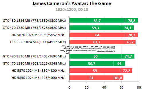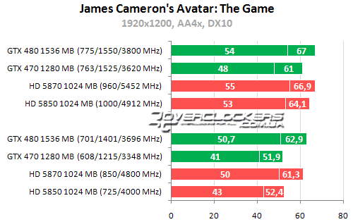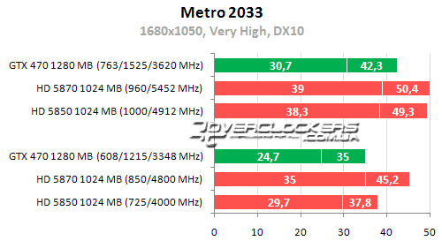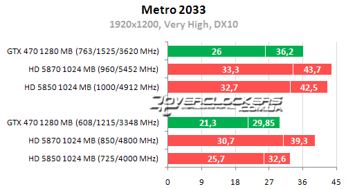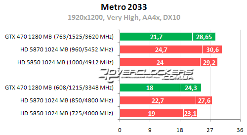 И снова место аутсайдера занимает GeForce GTX 470, уступая в номинале 27-29 % старшему GeForce GTX 480. Отставание от Radeon HD 5850 по минимальному fps порядка 5 %, по среднему показателю — внушительные 17-19%. Младшая карта AMD, в свою очередь, уступает старшему брату 15-18%, а топовой карте NVIDIA не более 10% по среднеигровому показателю, и до 20% по минимальному fps.