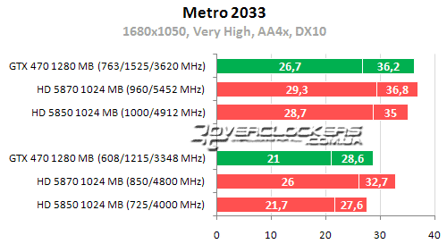 GeForce GTX 470 смотрится довольно неплохо, обходя даже Radeon HD 5870 в режимах со сглаживанием. Radeon HD 5850 хоть и является аутсайдером в номинале, но благодаря разгонному потенциалу легко обходит GeForce GTX 470 и Radeon HD 5870 на стандартных частотах.