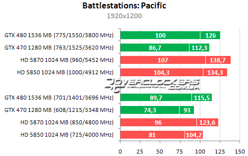 Снова мы видим преимущество GeForce GTX 470 над Radeon HD 5850, особенно по минимальному fps — до 17% в разрешении 1920х1200. Подобное отставание модель AMD легко компенсирует своим разгоном. Лучше всех в данной игре выглядит GeForce GTX 480, и даже GeForce GTX 470 с повышенными частотами не может догнать старший видеоадаптер.