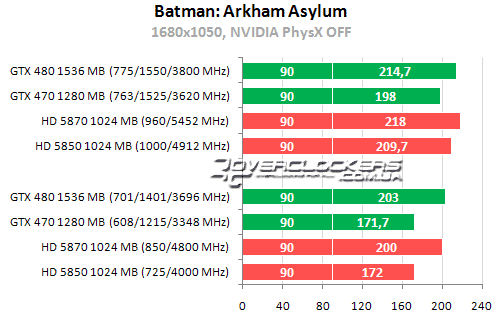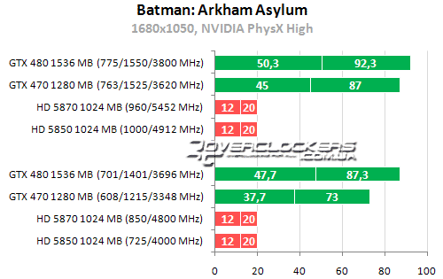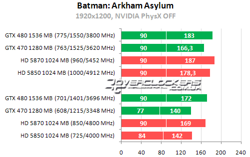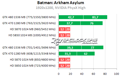 При включении NVIDIA PhysX системы с видеокартами AMD демонстрируют очень низкую производительность, и никаких различий между ними уже нет. Разница в производительности между обеими моделями GeForce достигает 25%, и разгон не помогает GeForce GTX 470 полностью компенсировать такое отставание от старшей модели.