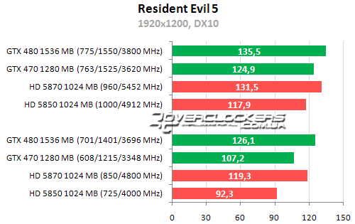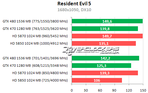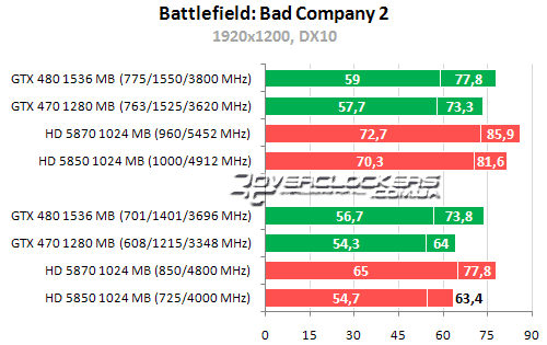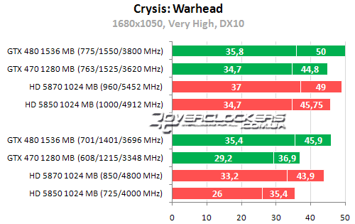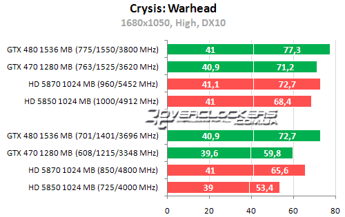 На максимальных настройках GeForce GTX 470 тоже показывает производительность выше чем Radeon HD 5850, но с повышением разрешения разница между ними почти исчезает. А вот в разгоне модель AMD обходит главного соперника, демонстрируя при этом частоту кадров выше, чем работающие в номинале старшие одночиповые ускорители GeForce GTX 480 и Radeon HD 5870.