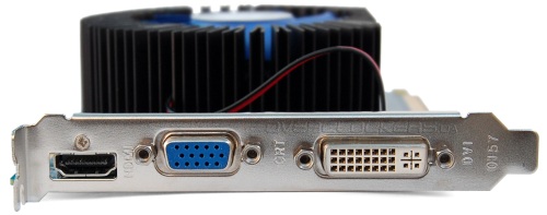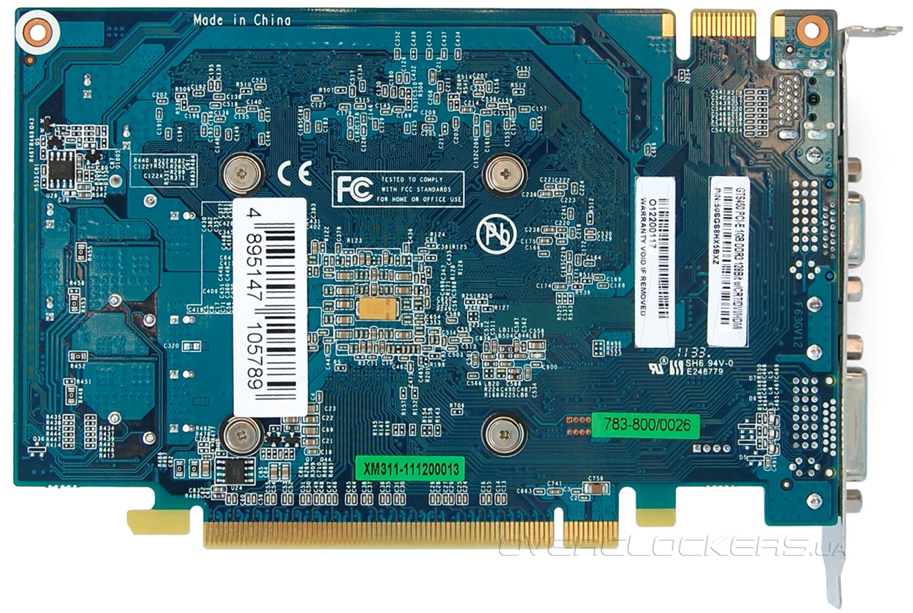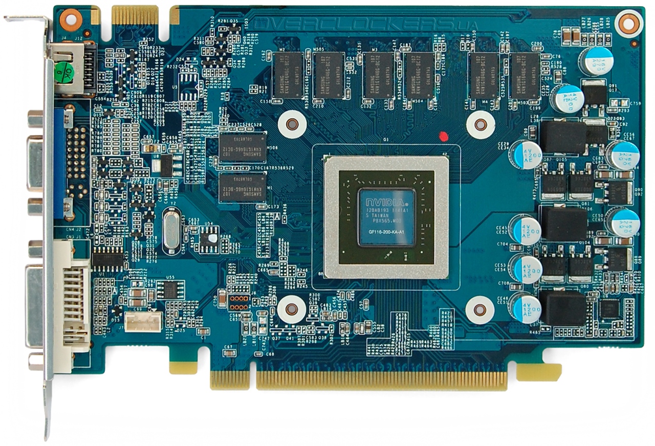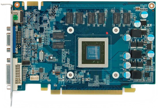 Расположение элементов на плате стало еще плотнее. Видно, что продукт более бюджетный, чем его «товарищ» с GDDR5. Используются транзисторы и дроссели попроще. Имеется разъем MIO для объединения видеокарт в SLI, которого лишены GeForce GT 440 и более простые графические карты NVIDIA.