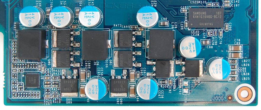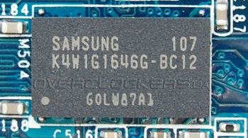 На PCB распаяно восемь микросхем памяти Samsung K4W1G1646G-BC12. В списке продуктов компании они обозначены как gDDR3, но по компоновке и характеристикам это, похоже, обычные чипы SDRAM DDR3.