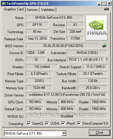 Память функционирует на частоте 1600 МГц, а вот номинал ядра остался без изменений — 783/1566 МГц. Это очень хорошие частотные показатели для GeForce GTS 450 без дополнительного питания. К примеру, MSI N450GTS-MD1GD3 работает на частоте ядра 700/1400 при частоте памяти 1333 или 1800 МГц, ASUS ENGTS450/DI/1GD3 — на 594/1189/1600 МГц, а Zotac GTS 450 ECO — на 600/1200/1333 МГц.