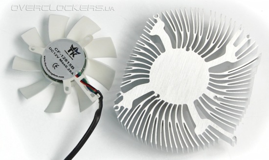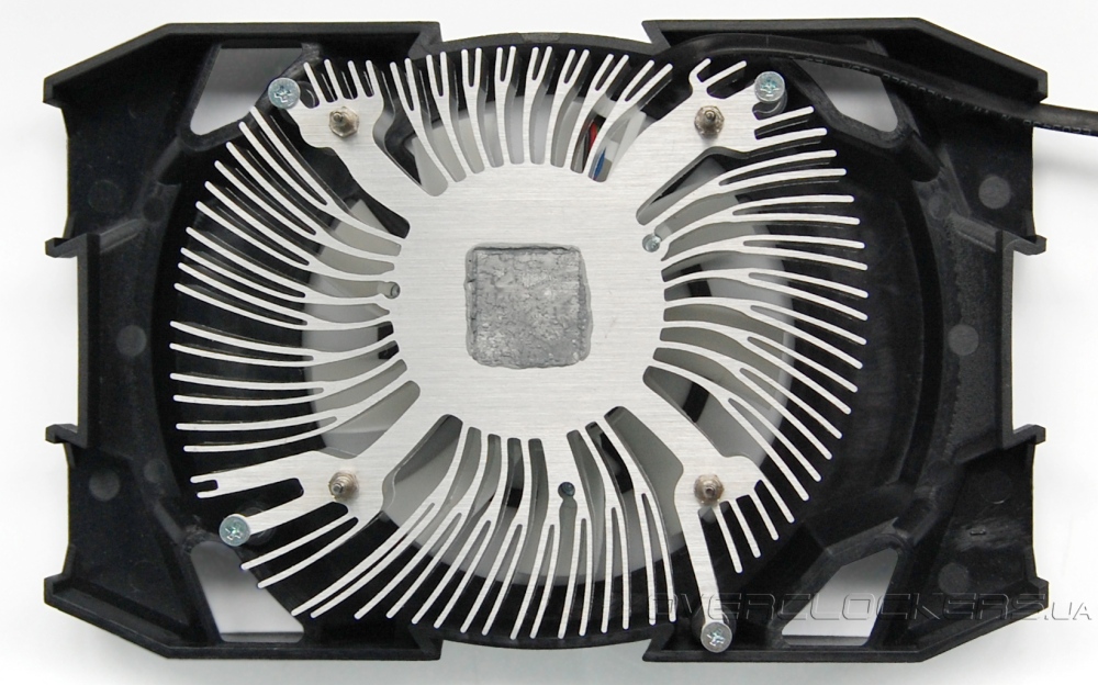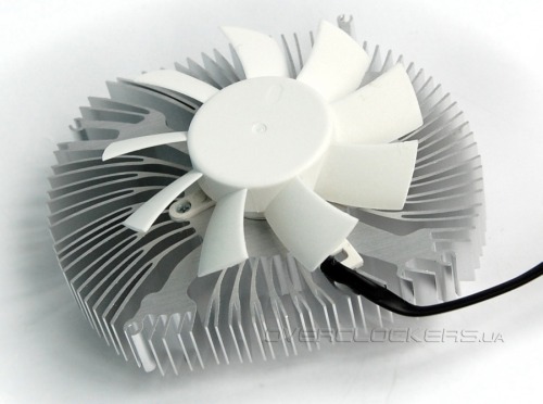 Радиатор выполнен из алюминия без использования каких-то медных вставок или тепловых трубок. Конструкция его напоминает кулера процессоров Intel. Такие же расходящиеся лепестки, раздваивающиеся на конце.