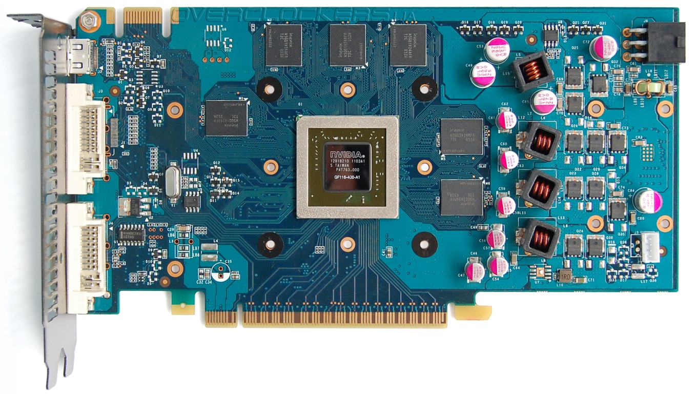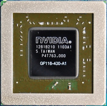Графический процессор GF116-400-A1 не имеет теплораспределительной крышки как у старших видеокарт GeForce. Кристалл окружен массивной защитной рамкой.