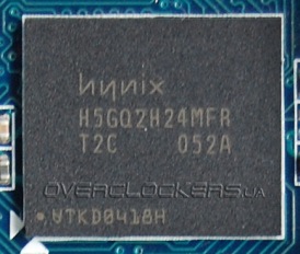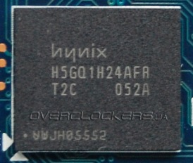Особенностью GeForce GTX 550 Ti является сочетание 192-битной шины памяти с объемом в один гигагайт. Контроллер памяти одновременно работает с чипами разной плотности и на плате распаяно четыре микросхемы Hynix H5GQ1H24AFR по 128 МБ вместе с двумя Hynix H5GQ2H24MFR T2C по 256 МБ.