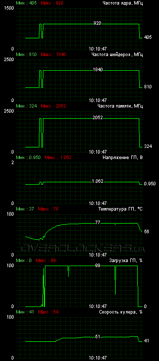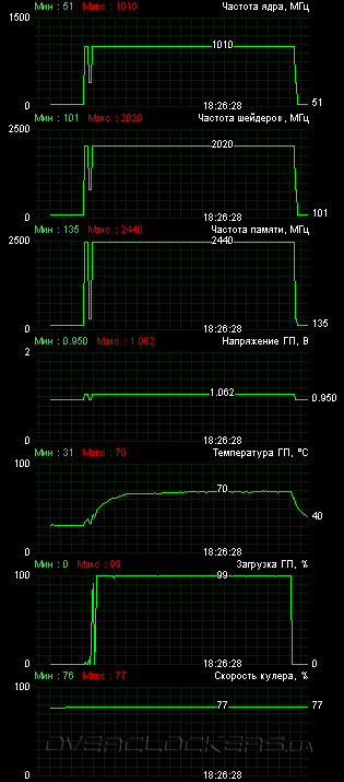 Для такого разгона пришлось поднимать обороты до максимума (в MSI Afterburner это были 77%), и шум уже был довольно высокий. Вообще вентилятор создавал довольно заметный гул начиная уже даже с 60%. Мы проверили, как поведет себя карта на высоких частотах при оборотах вентилятора на 55%. В итоге пройти все тесты не удалось, так что пользователю придется довольствоваться меньшими частотами или все же повышать обороты в ущерб акустическому комфорту. Характеристики тестируемых видеокарт