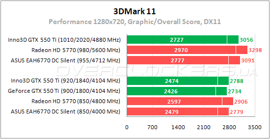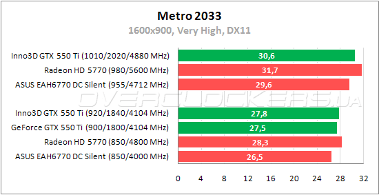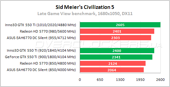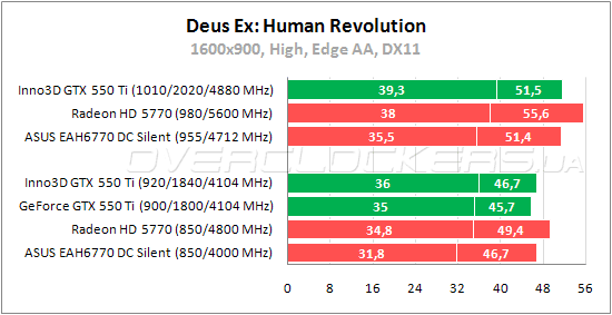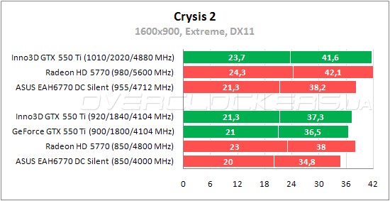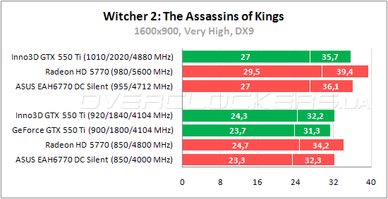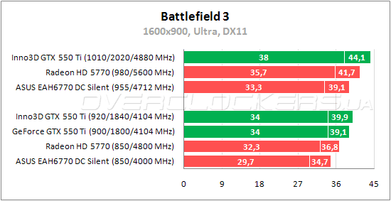 Inno3D выигрывает у референса стандартные 2%, но снова уступает Radeon HD 5770. Разгон повышает результат на 11%. При разгоне разница между Inno3D GTX 550 Ti и Radeon HD 5770 уменьшается, но лидером по-прежнему остается карта AMD.