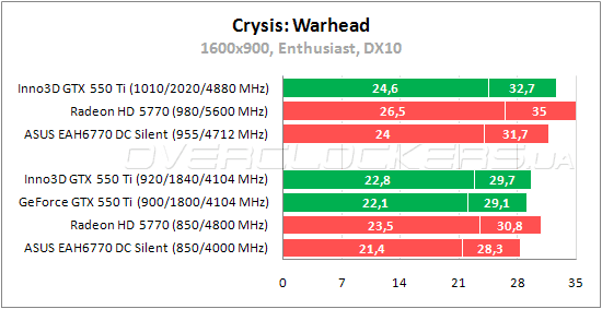 В данной игре преимущество у видеокарт NVIDIA. Результат Inno3D GTX 550 Ti на 13% выше, чем у Radeon HD 5770, и на 16% больше результата ASUS EAH6770 DC SL/2DI/1GD5. Разгон помогает поднять производительность лишь на 8,5%. А разогнанный Radeon HD 5770 как раз выходит на один уровень с картой Inno3D.