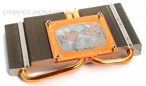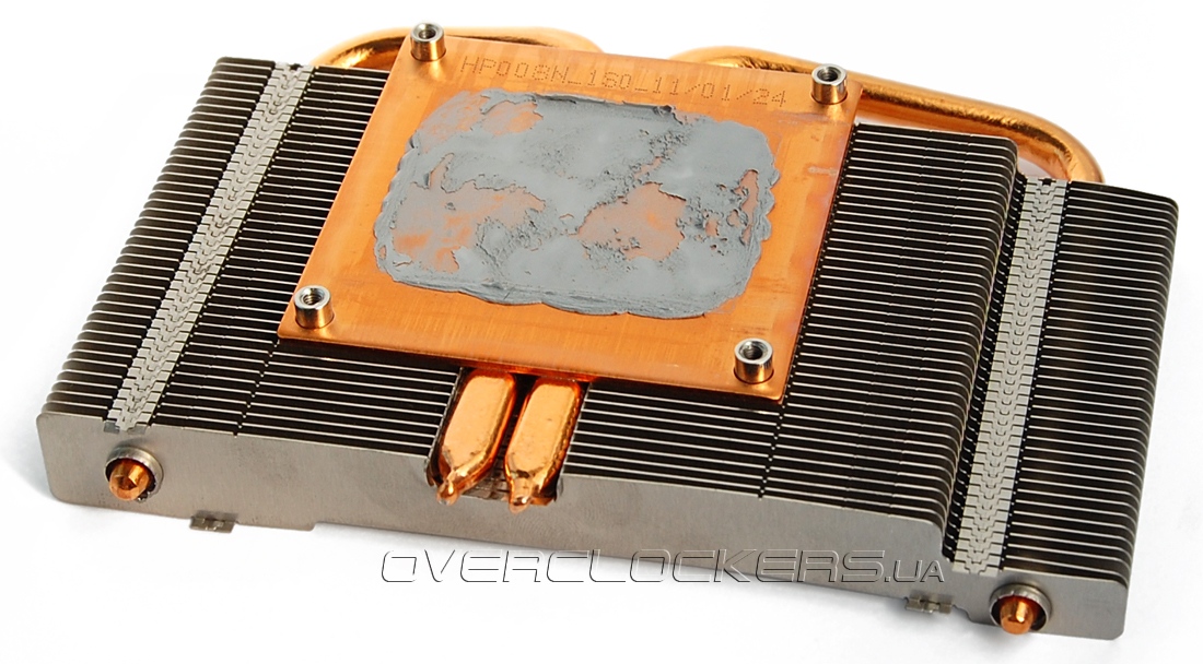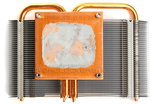 Конструкция радиатора довольно простая — большое медное основание, две тепловые трубки и массив тонких алюминиевых пластин.