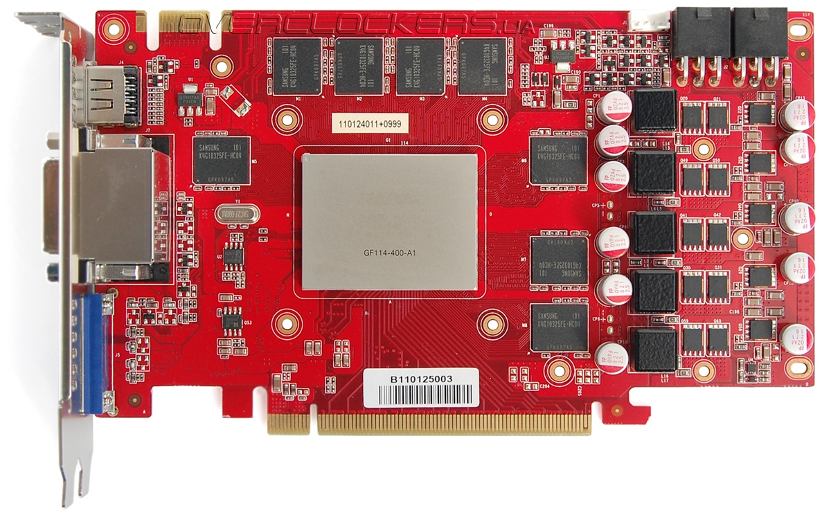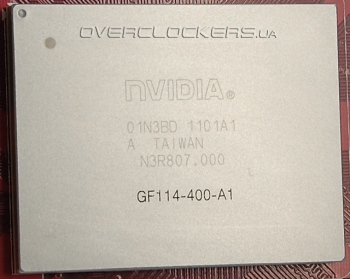 Графический процессор накрыт большой защитной крышкой. В последних GPU маркировка наносится светлым цветом, четко виден лишь идентификационный номер чипа GF114-400-A1.