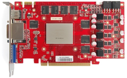 Объем памяти стандартный — один гигабайт. Распаяно восемь микросхем Samsung K4G10325FE-HC04 со временем выборки 0,4 нс.