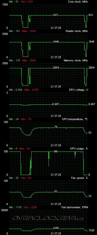 При нагрузке Crysis Warhead на максимальных настройках качества в разрешении 1920x1200 со сглаживанием ядро прогрелось до 78 °С (при 23 градусах в помещении). Вентилятор при этом раскручивался до 2250 об/мин.