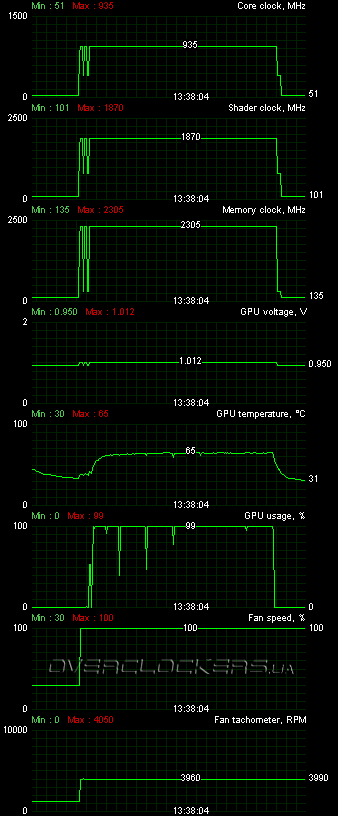 Зафиксировав через MSI Afterburner обороты вентилятора на 100%, мы смогли разогнать видеокарту по ядру до 935/1870 МГц, память покорила отметку в 4610 МГц.
