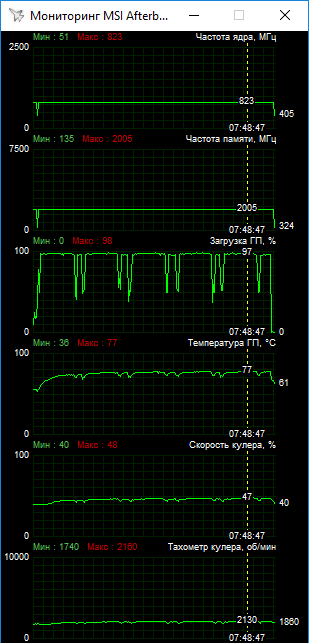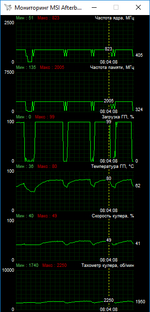 В качестве небольшой иллюстрации температурного режима ниже приведено два скриншота мониторинга параметров во время игровых тестах. Ядро греется до 77–80 °С, а вентилятор раскручивается до 2100–2250 об/мин.