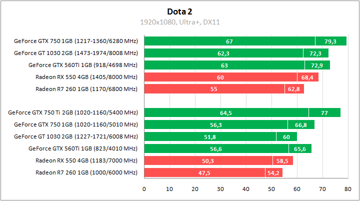 GeForce GTX 560 Ti реабилитируется в Dota 2, обгоняя всех конкурентов AMD и GeForce GT 1030. В номинале идентичные показатели с GeForce GTX 750, а разгон позволяет GeForce GTX 560 Ti приблизиться к GeForce GTX 750 Ti.
