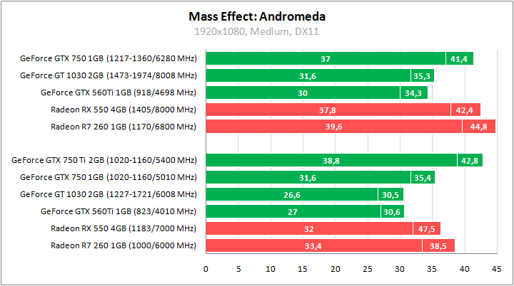 Идентичные показатели у GeForce GTX 560 Ti и GeForce GT 1030 в Andromeda, но оба участника серьезно проигрывают другим соперникам. Разгон выводит старичка на один уровень с GeForce GTX 750 и Radeon RX 550 в номинале.