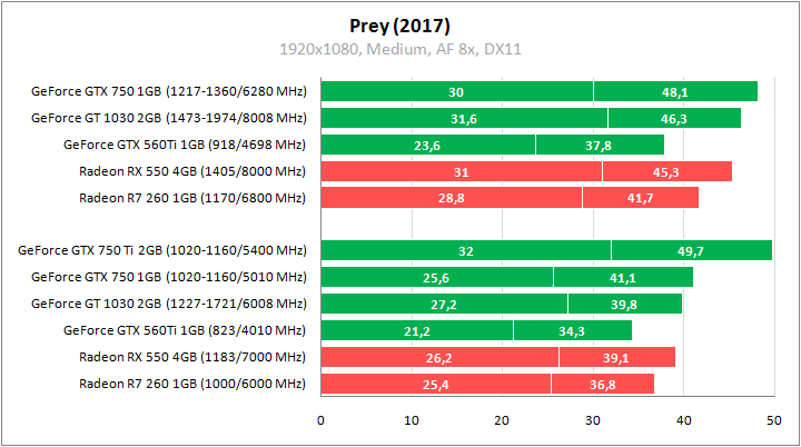GeForce GTX 560 Ti показывает самые слабые результаты в Prey, уступая 16–28% ближайшим товарищам в лице GeForce GT 1030 и GeForce GTX 750. Разрыв с конкурентами AMD чуть меньше, но тоже весомый. Разгон позволяет выйти на уровень показателей Radeon R7 260.