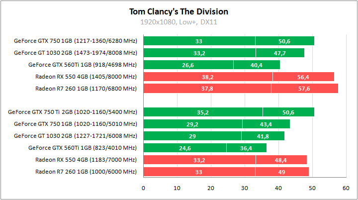 Самые низкие показатели у старичка и в The Division. Он проигрывает более 15% новому GeForce GT 1030, что в полной мере разгоном не компенсируется. Разница с другими соперниками еще больше.
