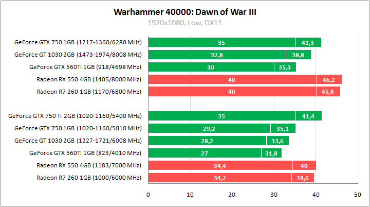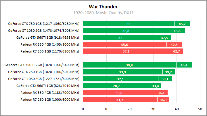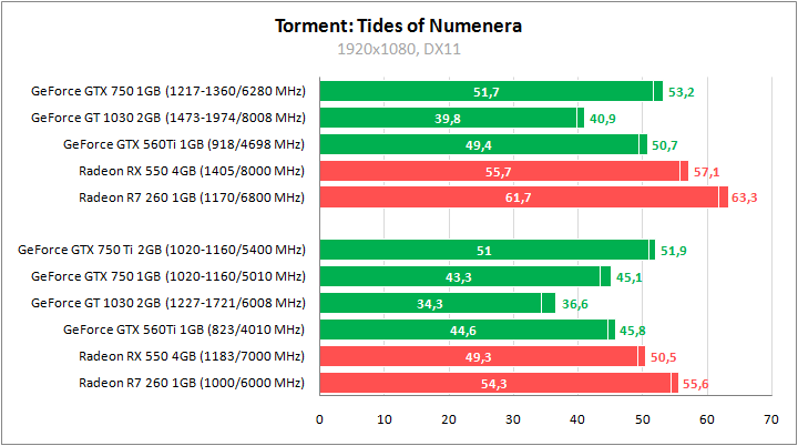 GeForce GTX 560 Ti показывает резкий отрыв от GeForce GT 1030 и минимальное преимущество над GeForce GTX 750. После разгона удается выйти на уровень производительности Radeon RX 550.