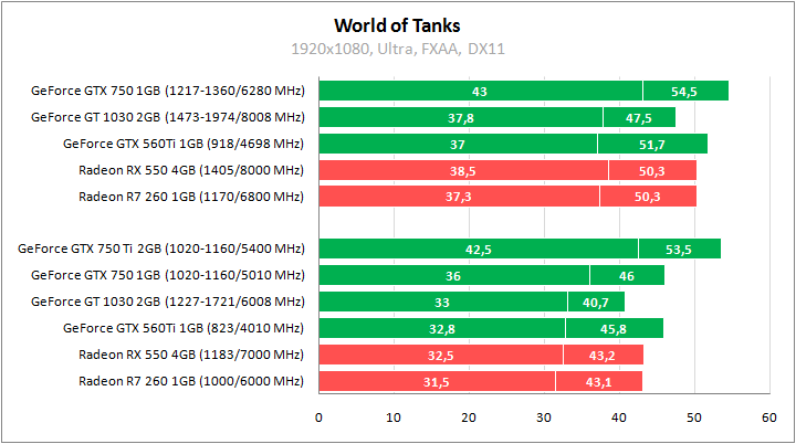 GeForce GTX 560 Ti неплохо играет мускулами в WoT, уверенно обгоняя GeForce GT 1030 и Radeon RX 550. Отставание от GeForce GTX 750 минимальное, а повышение частот позволяет приблизиться к результатам GeForce GTX 750 Ti.