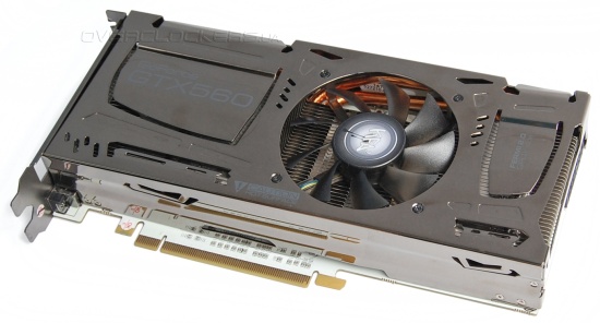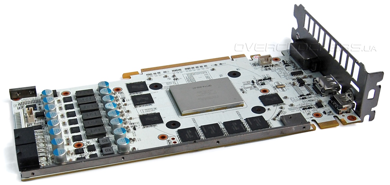 Инженеры Galaxy/KFA2 по максимуму использовали весь доступный объем. Мало того, что радиатор сам по себе внушительный, так даже корпус рассеивает тепло. Но при таком продуманном охлаждении графического процессора производитель абсолютно забыл об охлаждении компонентов системы питания. Соответствующего радиатора нет. А вентилятор хоть и расположен не по центру, но силовые элементы все равно находятся вне основной зоны обдува, чуть сбоку. Кстати, использование традиционного вентилятора с таким длинным радиатором тоже вызывает вопросы. Чтобы длинная секция радиатора нормально продувалась, нужен мощный воздушный поток. Возможно, лучше было бы организовать охлаждение по типу «турбины», оснастив кулер радиальным вентилятором.