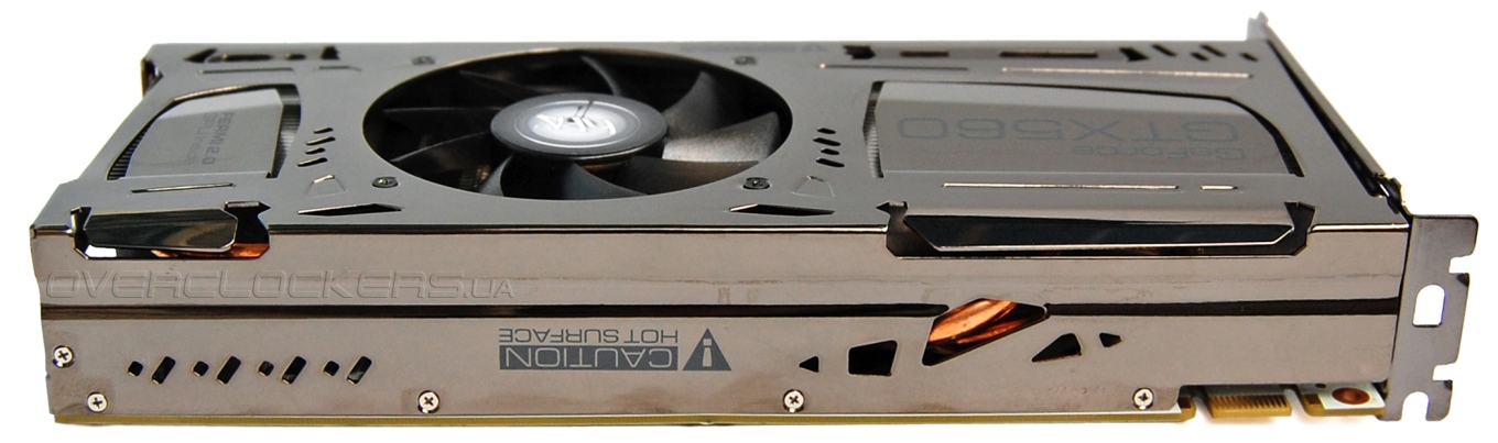 Металлический кожух с радиатора не снимается. Похоже, он припаян к левой части радиатора, там, где красуется надпись GeForce GTX 560Ti. Этим и объясняется предупреждение о температуре надпись на кожухе. Хотя на самом деле греется он слабо.