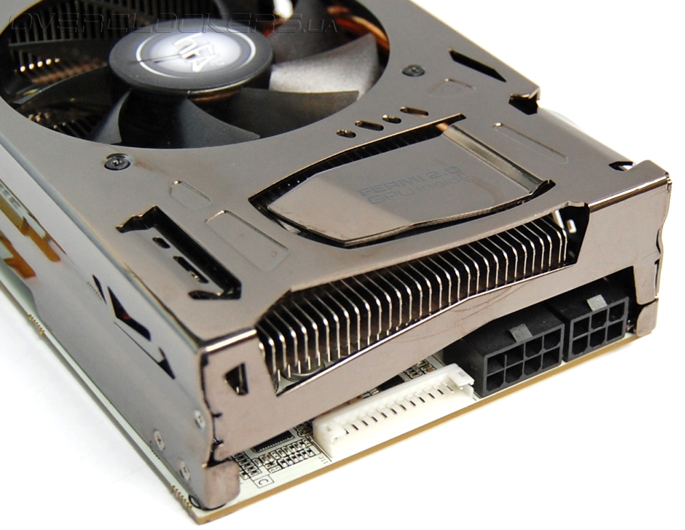 Если рядовой GeForce GTX 560 Ti обходится двумя шестиконтактными разъемами, то у KFA2 LTD один шестиконтактный дополнен восьмиконтактным. Кстати, возле них расположен большой разъем на 14 контактов, назначение которого, честно говоря, нам неизвестно.