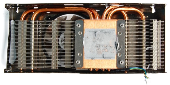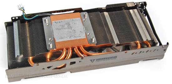 Радиатор системы охлаждения выполнен во всю длину платы. Из медного основания, контактирующего с графическим процессором, выходят четыре тепловые трубки, которые несут на себе массив тонких алюминиевых пластин. Верхней крышки у основания нет, пластины напаяны прямо на медную пластину и тепловые трубки. Диаметр вентилятора 80 мм.