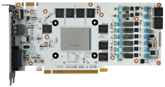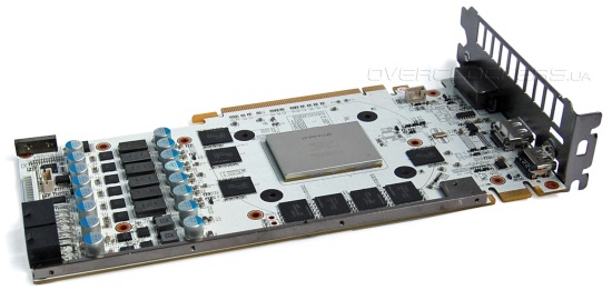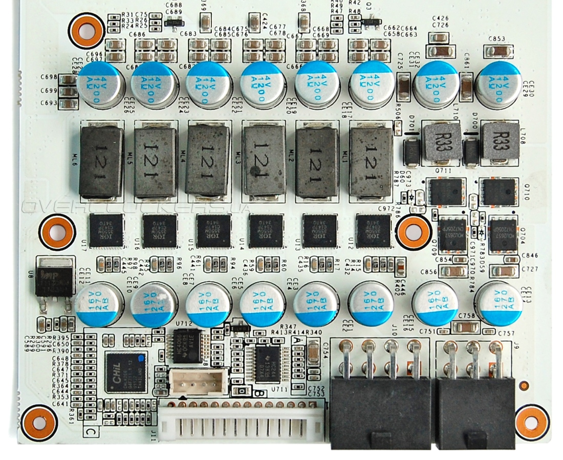 В обвязке GPU вместе с танталовыми конденсаторами используется Proadlizer NEC/TOKIN. Система питания графического процессора выполнена по шестифазной схеме с использованием DrMOS-микросхем IR3550 под управлением ШИМ-контроллера CHiL 8266. Двухфазная система питания памяти GDDR5 реализована на контроллере uP6210AG.