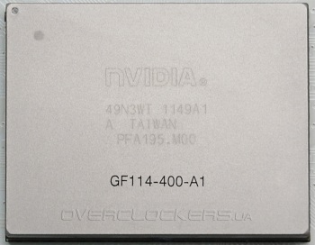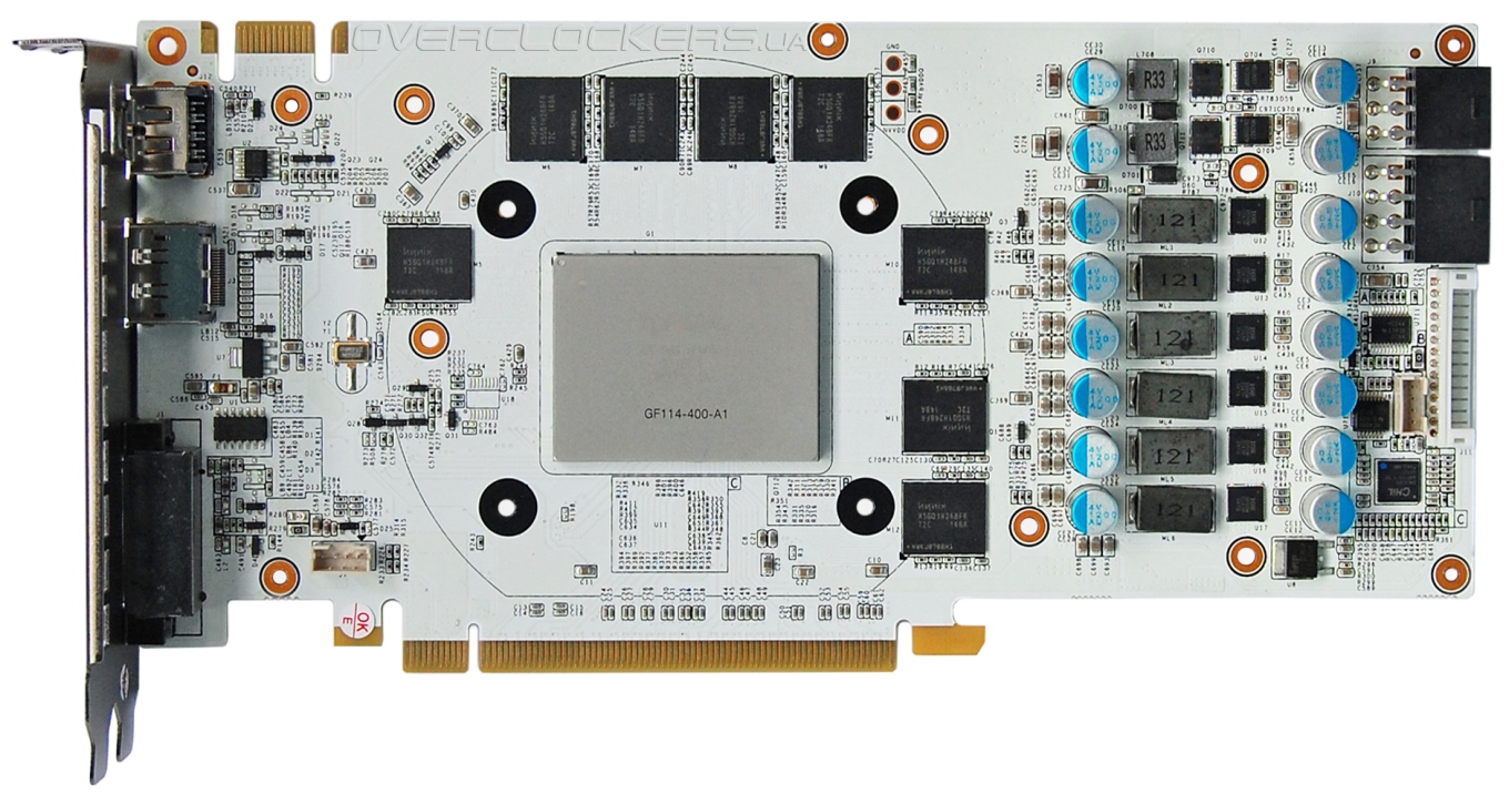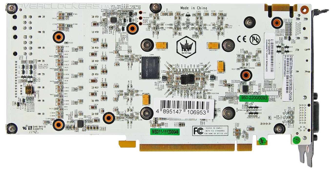 Видеокарта выполнена по оригинальному нереференсному дизайну. На наклейке с обратной стороны указано название SOC White Edition, что соответствует точно такой же карте, которая продается под маркой Galaxy. Зеленая наклейка 950-2200/0903 указывает на рабочие частоты видеокарты для ядра и памяти — 950 МГц и 2200 (эффективные 4400) МГц.