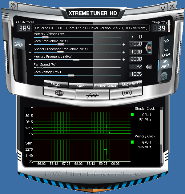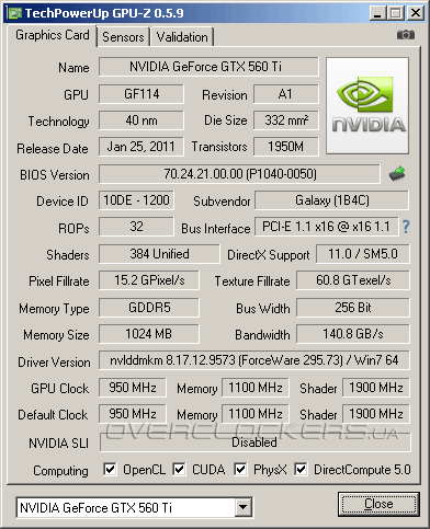 Заводской разгон у KFA2 GTX 560 Ti LTD OC весьма солидный — до 950/1900/4400 МГц. Это на 15 и 10 процентов выше стандартных спецификаций. Рабочее напряжение GPU составляет 1,025 В.