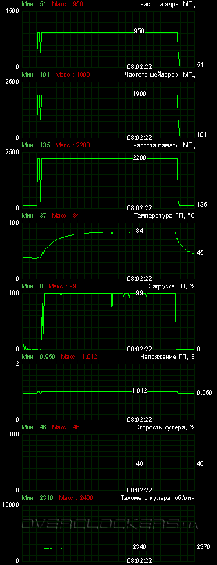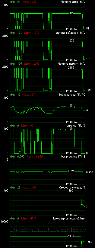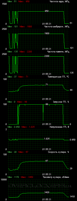 В условиях, когда даже в номинале трудно достичь приемлемого уровня шума, можно забыть о практическом разгоне со стоковым охлаждением. Однако проверить возможности карты мы не могли. Вот только даже при максимальных оборотах разгон оказался небольшим и весьма условным. Графический процессор легко преодолевал рубеж в 1 ГГц, но карта работала нестабильно. Не удавалось даже пройти 3DMark 11 в разрешении 1280x720, не говоря уж о более тяжелых тестах. Убив кучу времени на подбор частот, мы так и не смогли одолеть наш стандартный 12-минутный тест даже при скромном разгоне по ядру. В итоге решили остановиться на такой частоте, при которой удавалось прогнать все выбранные тесты, а в Crysis подопытный продержался дольше всего. Этим рубежом относительной стабильности стали 985/1970 МГц. Память смогла нормально функционировать на частоте 4710 МГц — хороший результат, но далеко не лучший.