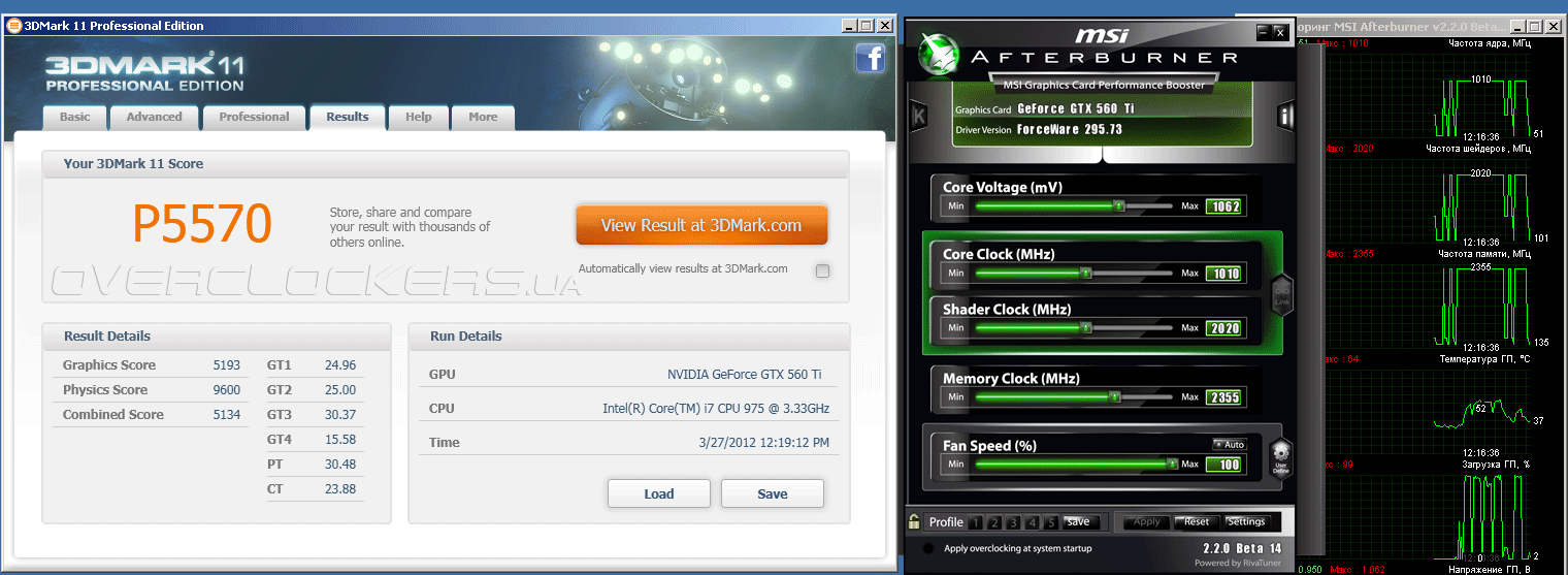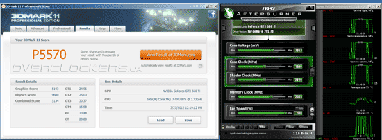 Пройти 3DMark 11 удалось лишь на 1010/2020/4710 МГц. Тоже не лучший результат для GeForce GTX 560 Ti. MSI N560GTX-Ti Hawk смог пройти этот тест на частотах 1045/2090/5080 МГц, Gigabyte GV-N560SO-1GI справился с этой задачей на 1035/2070/4970 МГц.