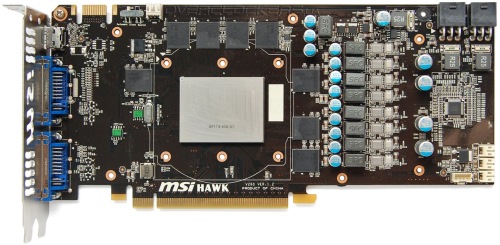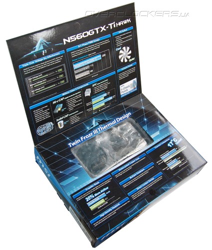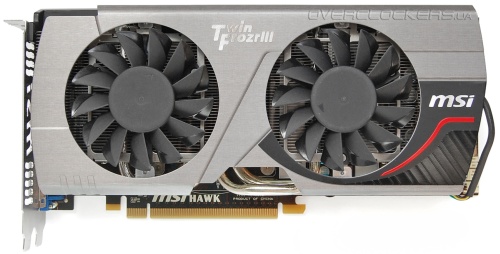 Рабочие частоты MSI повышены с 823/1645/4008 МГц до 950/1900/4200 МГц для ядра, шейдерных блоков и памяти GDDR5. Не самые высокие значения. Существуют и более быстрые карты — те же Gigabyte GV-N560SO-1GI (1000/2000/4580 МГц) и Sparkle Calibre X560 (1000/2000/4800 МГц). Но они выпущены ограниченным тиражом, а N560GTX-Ti Hawk дефицитом не является. Да и гигагерцовые карты не идеальны — Gigabyte шумноват, Sparkle требовал дополнительного охлаждения. Посмотрим, как проявит себя Hawk.
