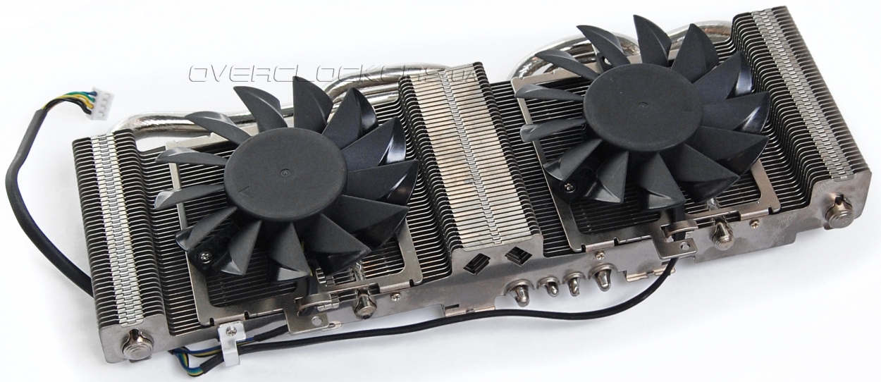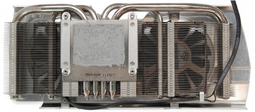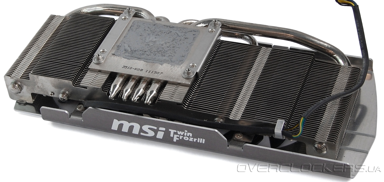 Конструкция системы охлаждения тоже вполне стандартная. От кулера Twin Frozr флагманских видеоадаптеров данная система отличается только меньшими размерами, плюс вместо пяти тепловых трубок используется четыре. Боковые трубки имеют диаметр 8 мм, центральные по 6 мм.