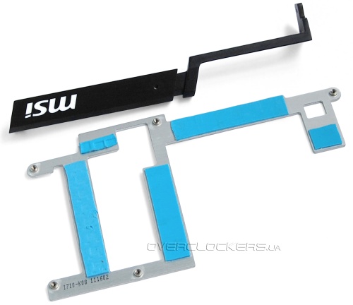 На микросхемы памяти и силовые компоненты системы питания установлен единый радиатор в виде простой пластины. С ребром жесткости радиатор не контактирует. А сама же черная планка выполнена из двух частей, зафиксированных винтом.