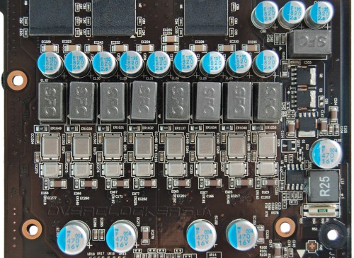 Основной переработке подверглась система питания, выполненная по схеме «8+1». Используются высококачественные компоненты Military Class II. В частности, на плате мы видим «мосфеты» нового поколения в корпусе DirectFET, которые пока еще никто кроме MSI не использует на видеокартах. И до недавнего времени это была прерогатива флагманских продуктов — N580GTX Lightning, R6970 Lightning и N480GTX Lightning.