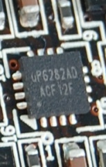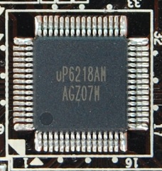 Восьмифазный преобразователь напряжения GPU выполнен на контроллере uPI Semiconductor uP6218AM с использованием четырех MOSFET Driver uP6282 (по две фазы на каждый).