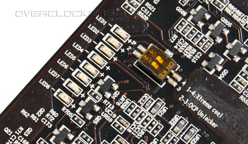 На задней стороне платы распаяны светодиоды, которые являются индикаторами активных фаз питания. Возле них расположено два миниатюрных переключателя — OCP Unlocker и Xtreme Cool, позволяющие снять ограничения по току и обойти cold bug при разгоне с использованием в качестве охладителя жидкого азота.