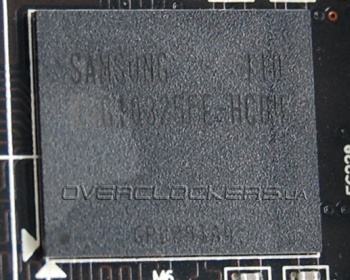 Объем видеопамяти — один гигабайт. Набран восемью микросхемами Samsung K4G10325FE HC04, которые рассчитаны на частоту 5 ГГц.