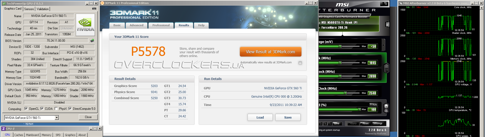 Что касается разгона, то N560GTX-Ti Hawk порадовал высокими результатами. После некоторых манипуляций с напряжениями (в большую сторону) мы смогли пройти 3DMark 11 на рабочих частотах 1045/2090/5080. И это, безусловно, лучший результат среди всех GeForce GTX 560 Ti побывавших в нашей лаборатории. До этого максимальный результат принадлежал адаптеру Gigabyte GV-N560SO-1GI, который смог одолеть 3DMark 11 при частотах 1035/2070/4970 МГц. В битве за абсолютное первенство Hawk смог обойти соперника на 10 МГц по ядру и на 90 МГц по частоте памяти.