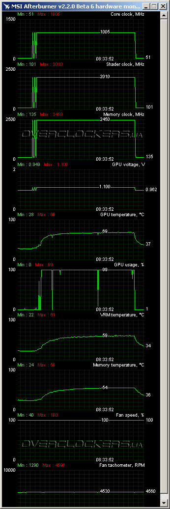 Как видно по верхнему скриншоту MSI Afterburner, у N560GTX-Ti Hawk кроме температуры ядра отслеживается еще температура памяти и VRM. Этим не может похвастать ни один другой GeForce GTX 560 Ti. И температура этих компонентов в автоматическом режиме управления оборотами вентилятора тоже весьма умеренная.