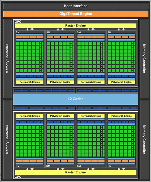 Структура нового графического чипа GF114 полностью повторяет GF104. Но видеокарты GeForce GTX 560 Ti используют его возможности по максимуму: активны все мультипроцессоры (Streaming Multiprocessor), так что общее число CUDA-ядер достигает 384, а текстурных блоков 64. Старый GeForce GTX 460 мог похвастать лишь 336 потоковыми процессорами и 56 TMU.