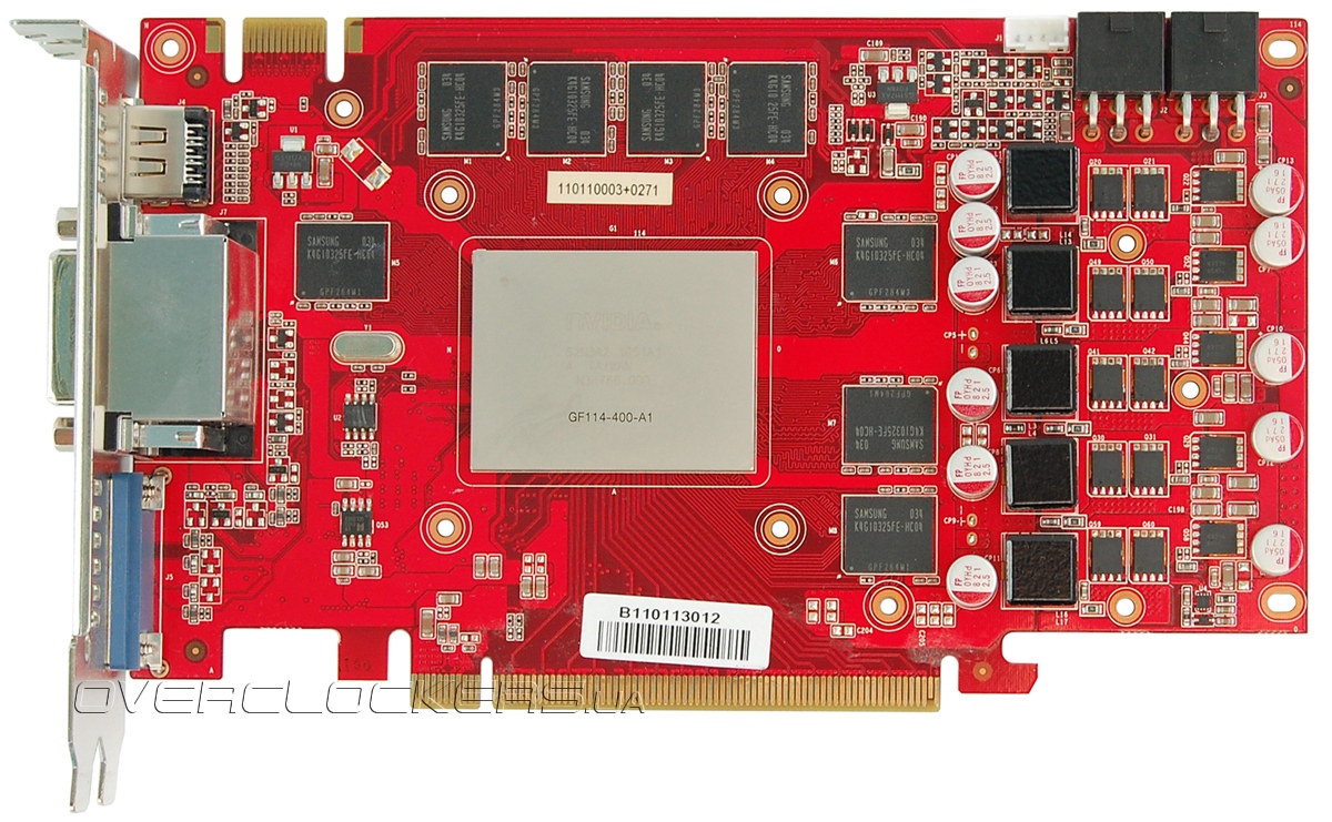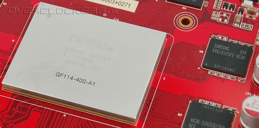 Маркировка на крышке GPU еле видна. Четко выделяется только серия самого чипа — GF114-400-A1. Память Samsung K4G10325FE-HC04 со временем выборки 0,4 нс.