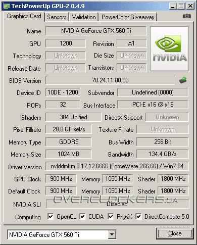 Ядро у GTX 560 Ti Sonic функционирует на 900/1800 МГц, память GDDR5 — на 4200 МГц. Это на 9,4 и 4,8 процентов выше стандартных спецификаций. О стабильных 900 МГц на старых GeForce GTX 460 можно было только мечтать, теперь это вполне реальные цифры.