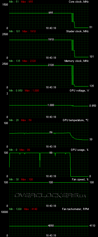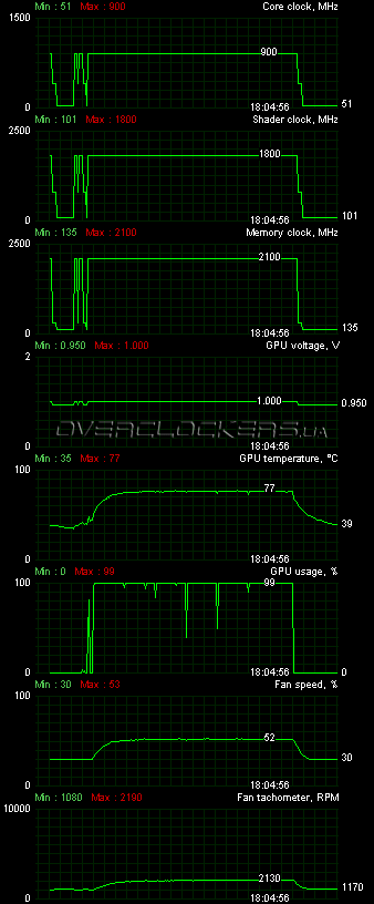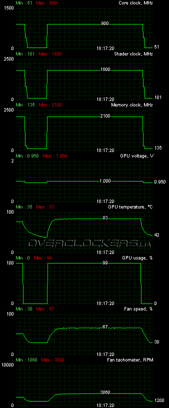 В тесте стабильности FurMark 1.8.2 ядро прогрелось до 83 °С, а вентиляторы работали уже на 67% (3090 об/мин) от своего максимума. Шум был уже естественно высокий, но система охлаждения достойно справилась с охлаждением даже в таком экстремальном режиме.